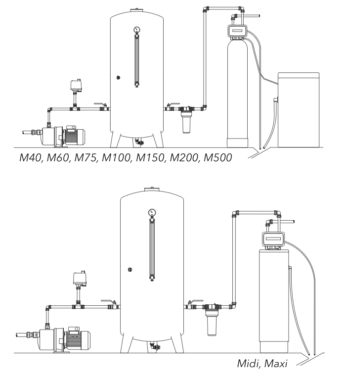M50 – M500 är en kalkavhärdare i världsklass. När det hårda vattnet passerar genom vattenfiltrets jonbytarmassa byter kalksalterna plats med lättlöslig natriumsalt, och blir mjukt. Denna avhärdare (även kallat mjukvattenfilter) har samma funktion som Midi, Maxi men med större kapacitet via separata filterbehållare och saltbehållare.